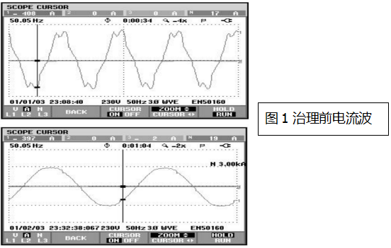 陜西某著名風(fēng)景區(qū)附近的星級(jí)酒店, 在未使用有源濾波器時(shí),總進(jìn)線開關(guān)無(wú)故跳閘,嚴(yán)重影響到酒店的經(jīng)濟(jì)效益。經(jīng)分析,該項(xiàng)目配電系統(tǒng)負(fù)載主要為節(jié)能燈、空調(diào)、水泵等設(shè)備,并存在三相不平衡的情況。同時(shí),電網(wǎng)中存在大量的諧波電流污染,主要以 3,5,7次為主,N 相電流極大,諧波含量大,三相不平衡嚴(yán)重(負(fù)序電流大) ,導(dǎo)致該變壓器下其他設(shè)備不能正常工作,同時(shí),變壓器發(fā)熱量大。之后采用有源濾波器集中補(bǔ)償諧波電流,共 6臺(tái)變壓器,每臺(tái)變壓器采用 150 A 有源濾波器。使用我司生產(chǎn)研制的型號(hào)ZD-AMS有源濾波器后,電流波形矯正明顯由極不平衡的狀態(tài)治理成了極為平滑的正弦波, 諧波電流有效值在超出濾波器容量范圍的情況下, 有源濾波器的補(bǔ)償率達(dá)到了90%以上,三相不平衡現(xiàn)象有所改善,有效解決了總進(jìn)線開關(guān)無(wú)故跳閘的問(wèn)題,具體情況如圖 1所示。